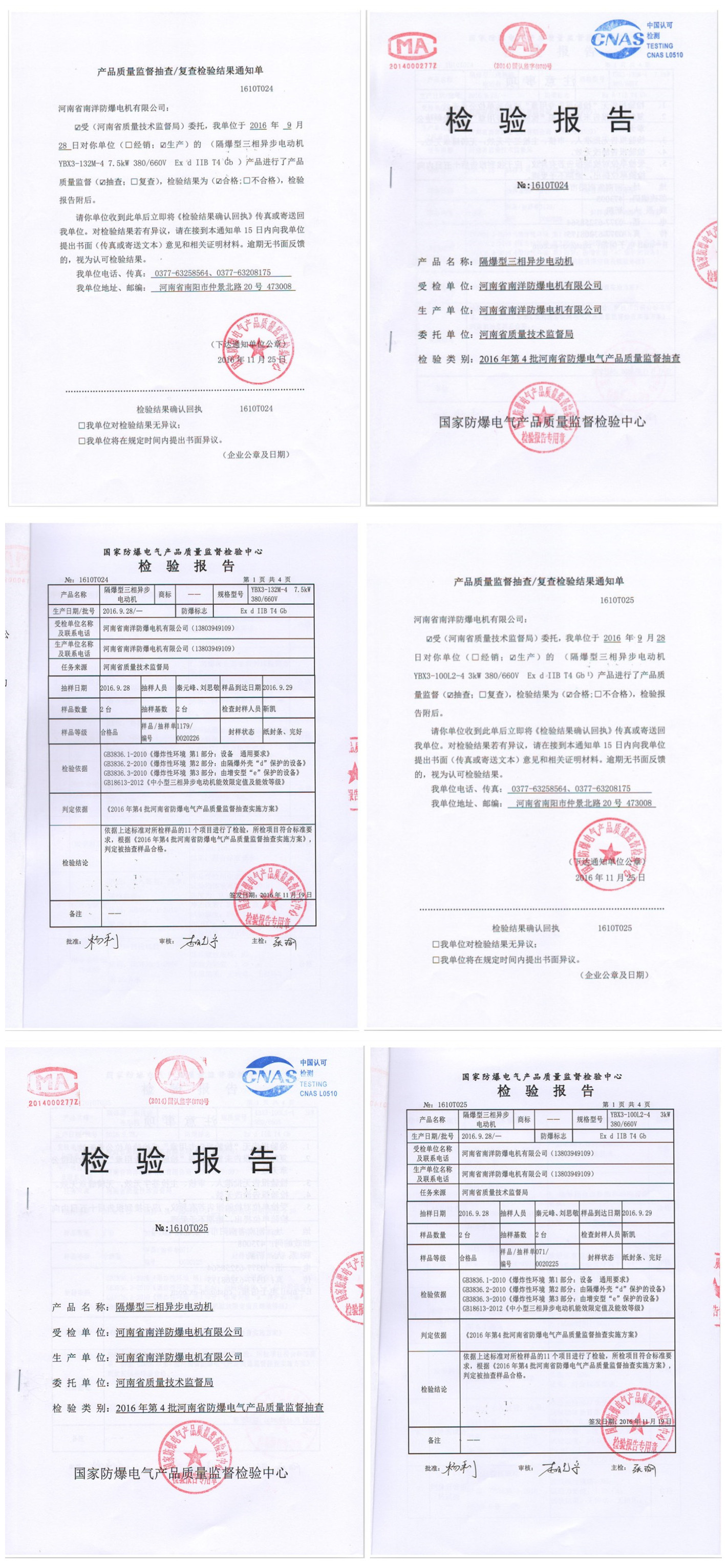 受河南省質(zhì)量技術(shù)監(jiān)督局的委托,2016年第四批河南省防爆電氣產(chǎn)品質(zhì)量監(jiān)督抽查悄然進(jìn)行。經(jīng)過(guò)抽樣檢查,我公司隔爆型三相異步電動(dòng)機(jī)YBX3-Ex d IIB T4 GB高效防爆電機(jī),完全符合GB3836-2010標(biāo)準(zhǔn)中防爆電氣的性能要求,符合GB18613-2012《中效型三相異步電動(dòng)機(jī)能效限定值及能效等級(jí)》的要求標(biāo)準(zhǔn)。